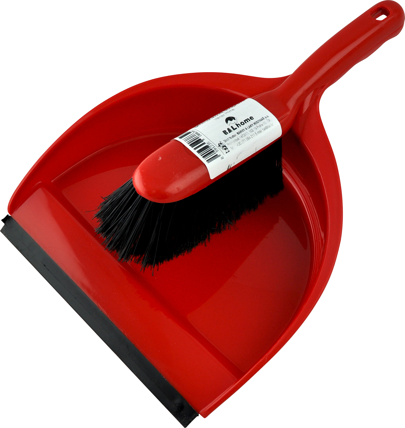 Plastowy zestaw zmiotki zawiera plastikową szufelkę z gumową listwą oraz formowaną rączkę i zmiotkę z czarnym włosiem.