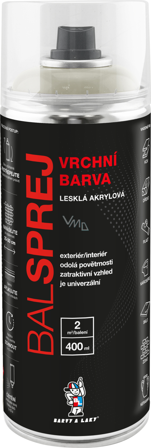 BALSPREJ je univerzální lesklá vrchní barva ve spreji použitelná k nátěrům dřeva, kovu, karoserií, některých umělých hmot. Vyniká vydatností, je rychleschnoucí, po nástřiku nestéká. Je odolná proti povětrnostním vlivům a korozi. Je přestříkatelná Bezbarvým akrylovým lakem ve spreji.