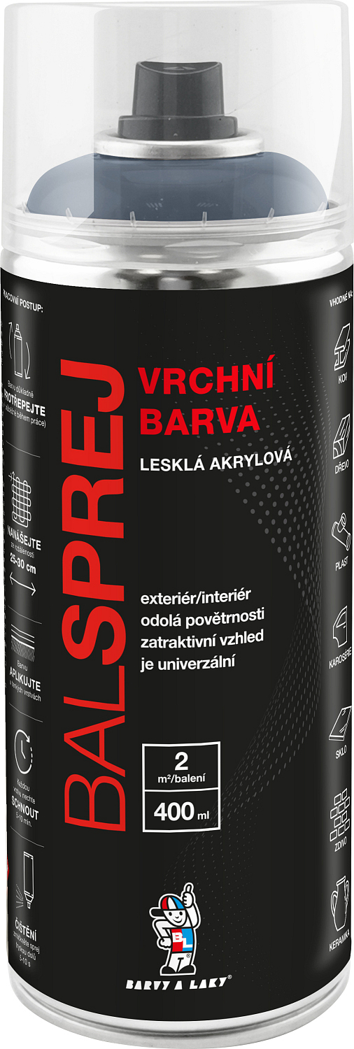BALSPREJ to uniwersalna błyszcząca farba w sprayu nadająca się do malowania drewna, metalu, karoserii, niektórych tworzyw sztucznych. Wyróżnia się wydajnością, szybko schnie i po naniesieniu nie spływa. Jest odporna na czynniki atmosferyczne i korozję. Można ją pokrywać bezbarwnym lakierem akrylowym w sprayu.