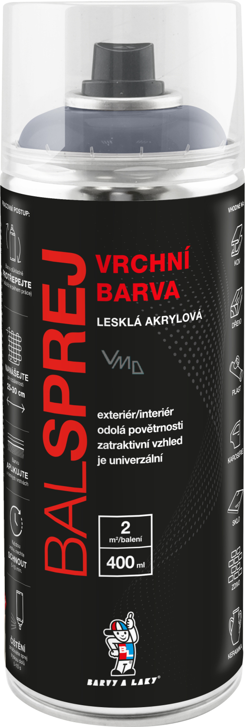BALSPREJ to uniwersalny błyszczący górny spray można stosować do malowania drewna, metalu, nadwozi, niektórych tworzyw sztucznych. Wyróżnia się wydajnością, szybko schnie i nie ścieka po nałożeniu. Jest odporna na działanie czynników atmosferycznych i korozję. Może być ponownie malowana bezbarwnym akrylowym lakierem w sprayu.