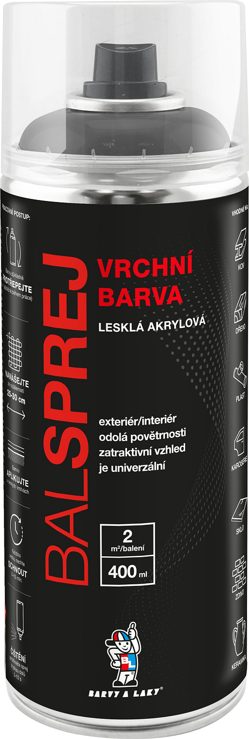 BALSPREJ jest uniwersalną błyszczącą farbą w sprayu można stosować do malowania drewna, metalu, karoserii, niektórych tworzyw sztucznych. Wyróżnia się wydajnością, szybko schnie i po nałożeniu nie spływa. Jest odporna na warunki atmosferyczne i korozję. Można ją pokryć bezbarwnym akrylowym lakierem w sprayu.