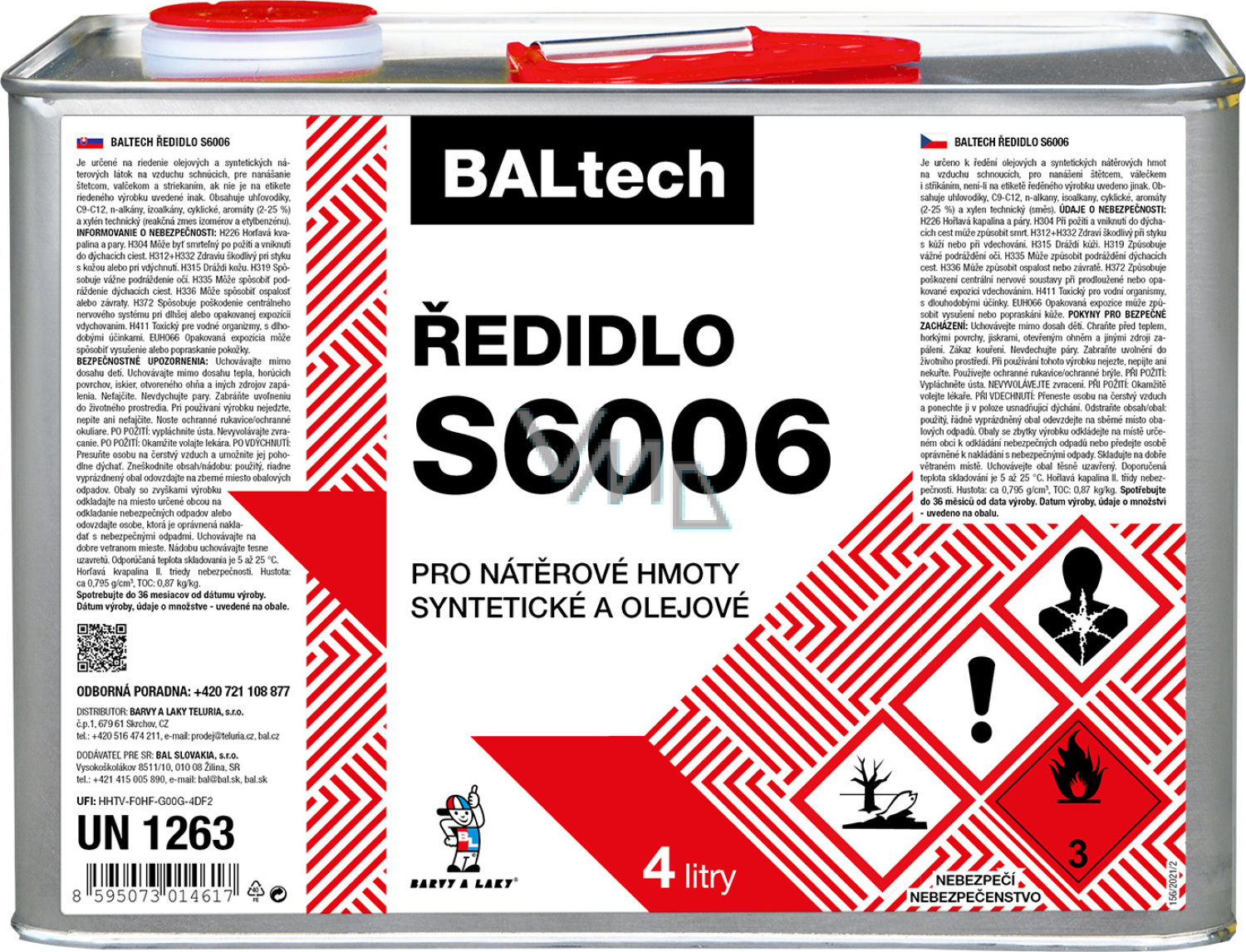 BALTECH S6006 Rozpusťovadlo jest przeznaczone do rozcieńczania olejowych i syntetycznych powłok malarskich schnących na powietrzu, do nakładania pędzlem, wałkiem i rozpylaczem, o ile na etykiecie rozcieńczanego produktu nie podano inaczej.
