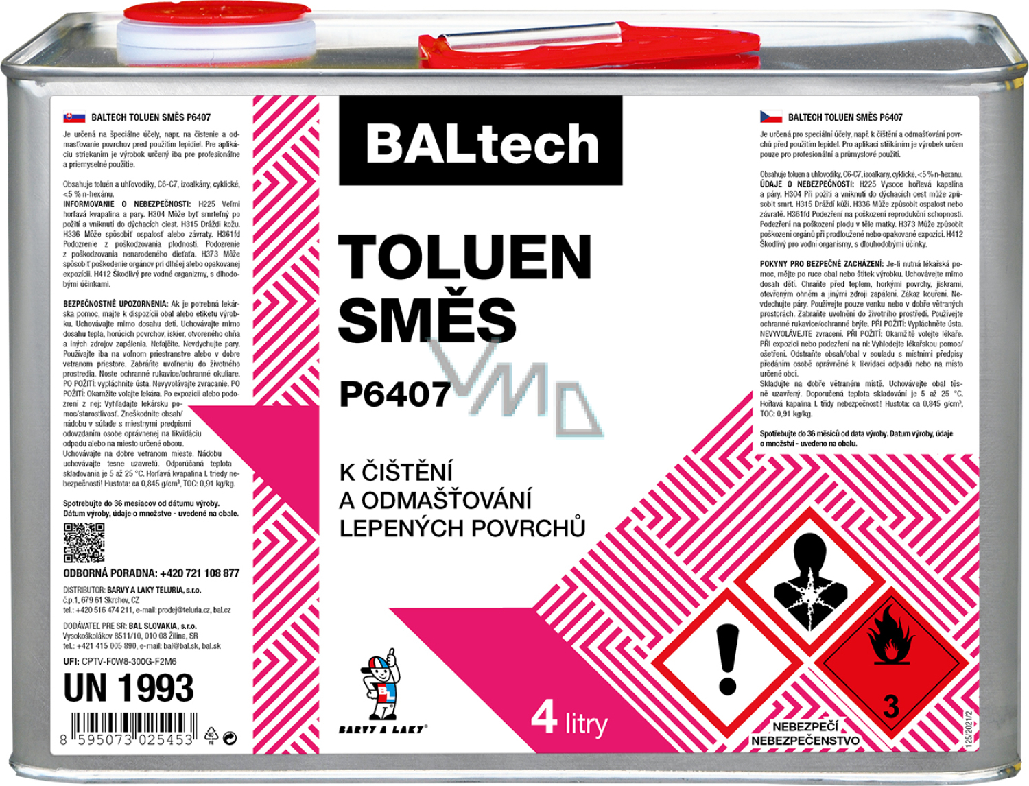 BALTECH P6407 MIESZANKA TOLUENU jest przeznaczony do specjalnych zastosowań, np. do czyszczenia i odtłuszczania powierzchni przed użyciem klejów. Do aplikacji natryskowej produkt jest przeznaczony tylko do profesjonalnego i przemysłowego użytku.