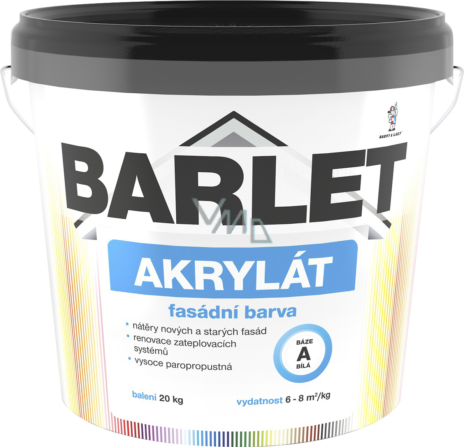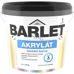 BARLET akrylát Plus báze A je nowoczesna akrylowa farba fasadowa przeznaczona do tonowania w naszych sklepach, biała baza A służy jako biała farba fasadowa. Przy niskim zużyciu doskonale kryje, maskuje mikrospękania i jest bardzo odpowiednia do renowacji systemów ociepleń. Używana jest do malowania tynków wapienno-cementowych, betonów, betonu kompozytowego, wiórów drewnianych oraz tynków renowacyjnych w pomieszczeniach i na zewnątrz.