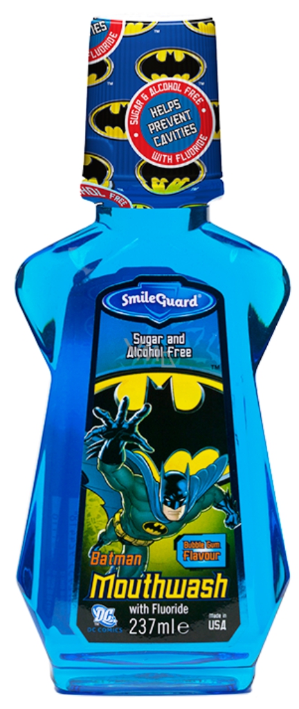 Ústní voda Batman pro motivaci dětí ke správné dentální hygieně. Kvalitně a profesionálně pečuje o dětský chrup, použití 1-2x denně po vyčištění zubů. Ústní voda pro děti bez alkoholu se žvýkačkovou příchutí. Ničí bakterie i v mezizubním prostoru, omezuje tvorbu zubního plaku.