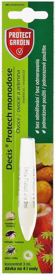 Decis® Protech monodose ovoce a zelenina patří o skupiny výrobků řady Garden Protec francouzské firmy SBM Life Science. Přestavuje insekticidní přípravek typu emulze olej ve vodě k hubení živočišných škůdců v bramboru, ovocných dřevinách, vinné révě, luskovinách, zelenině a jahodníku.