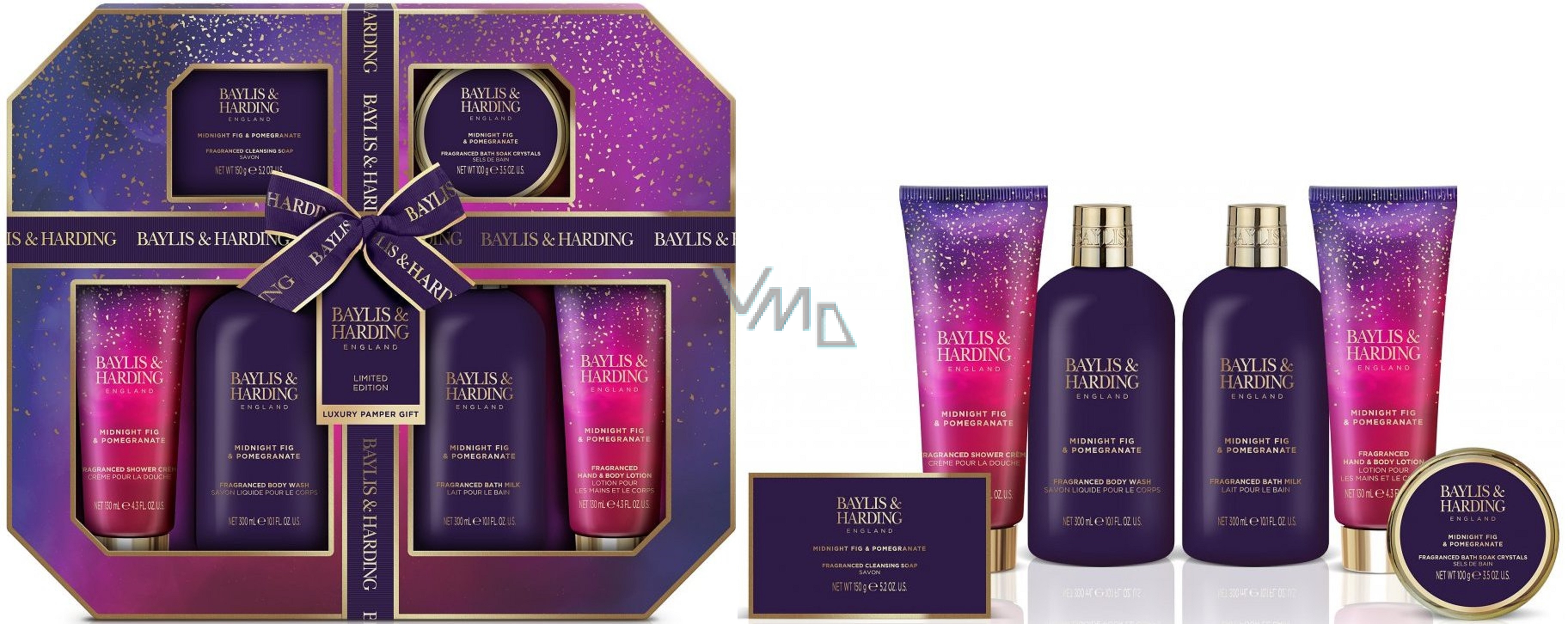 Baylis & Harding Fík a Granátové jablko sprchový gel 300 ml + mléko do koupele 300 ml + tuhé mýdlo 150 g + sprchový krém 130 ml + tělové mléko 130 ml + krystaly do koupele 100 g, kosmetická sada pro ženy