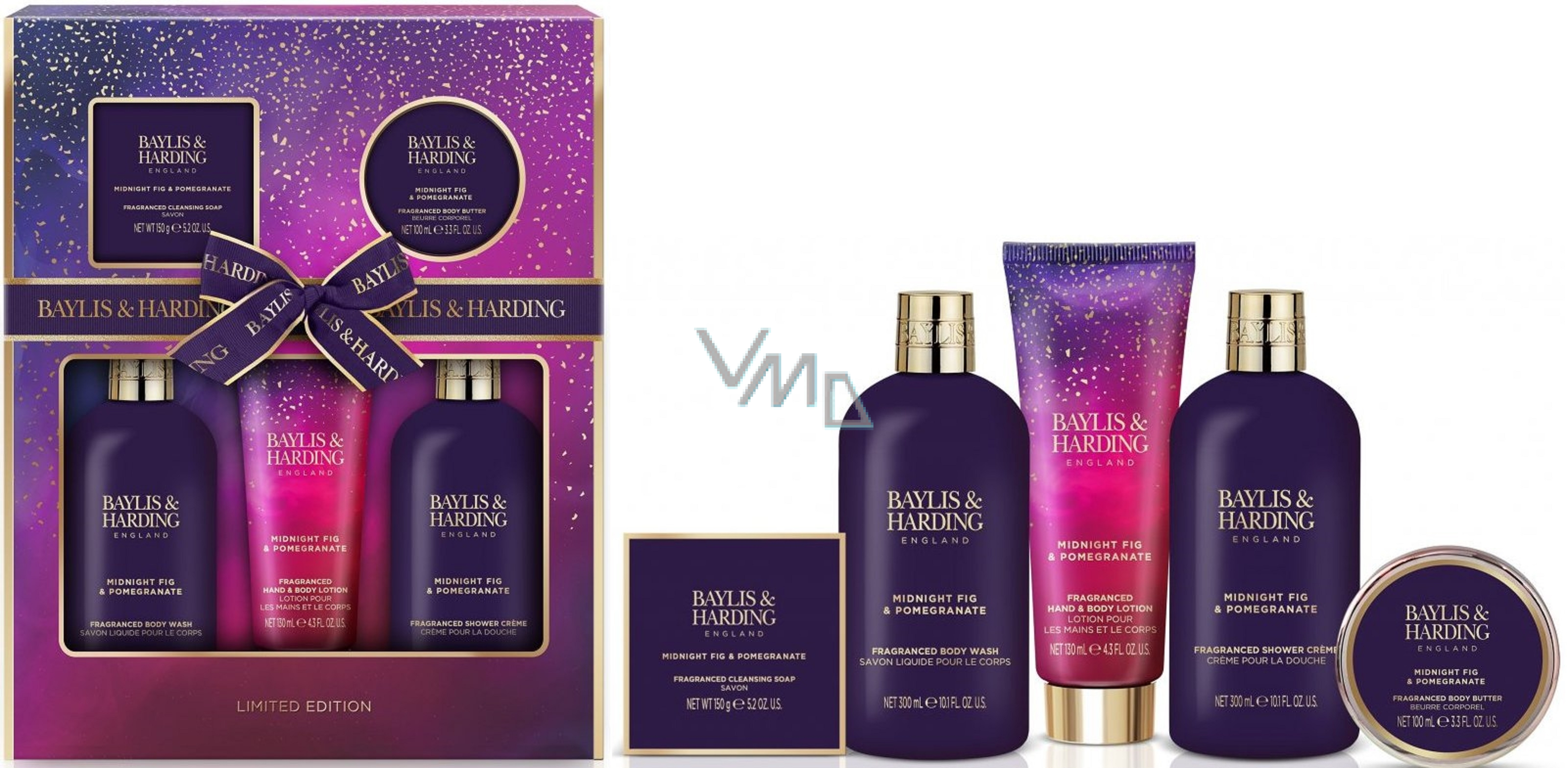 Baylis & Harding Fík a Granátové jablko sprchový gel 300 ml + sprchový krém 300 ml + tělové mléko 130 ml + toaletní mýdlo 150 g + krystaly do koupele 100 g, kosmetická sada pro ženy