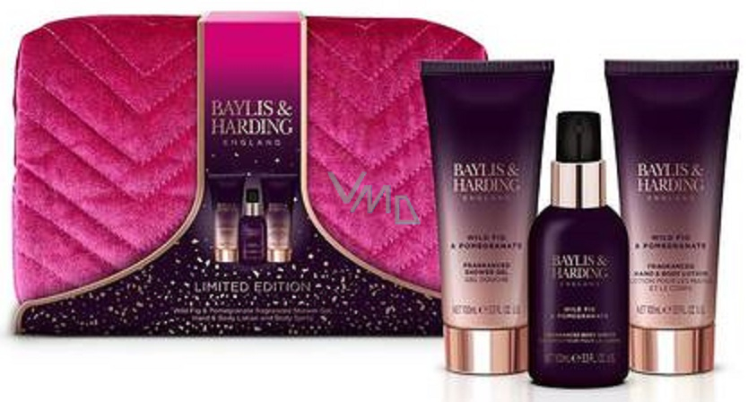 Baylis & Harding Fík a Granátové jablko tělový sprej 100 ml + sprchový gel 100 ml + mléko na ruce a tělo 100 ml + kosmetická taštička, kosmetická sada pro ženy