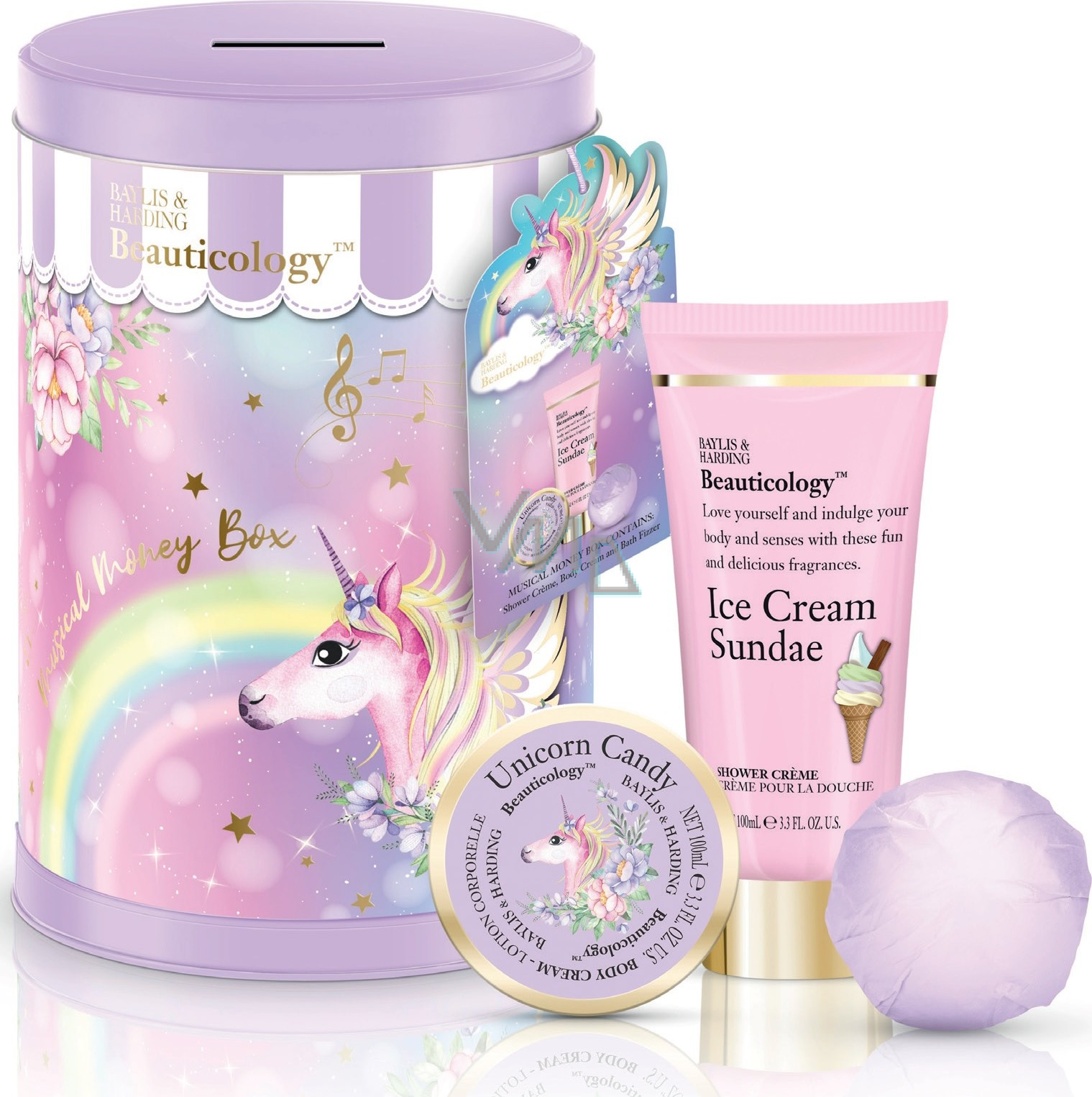 Obdarujte své nejmilovanější pohádkovým dárkovým setem s motivem oblíbených jednorožců. Dárkový set sprchového krému, tělového krému, šumivých koulí do koupele a stylové kasičky na peníze je praktickým a nezapomenutelným dárkem. Produkty vás zahalí neodolatelnou vůní sladkých cukrovinek a pastelové obaly se zlatými prvky rozzáří vaši koupelnu.