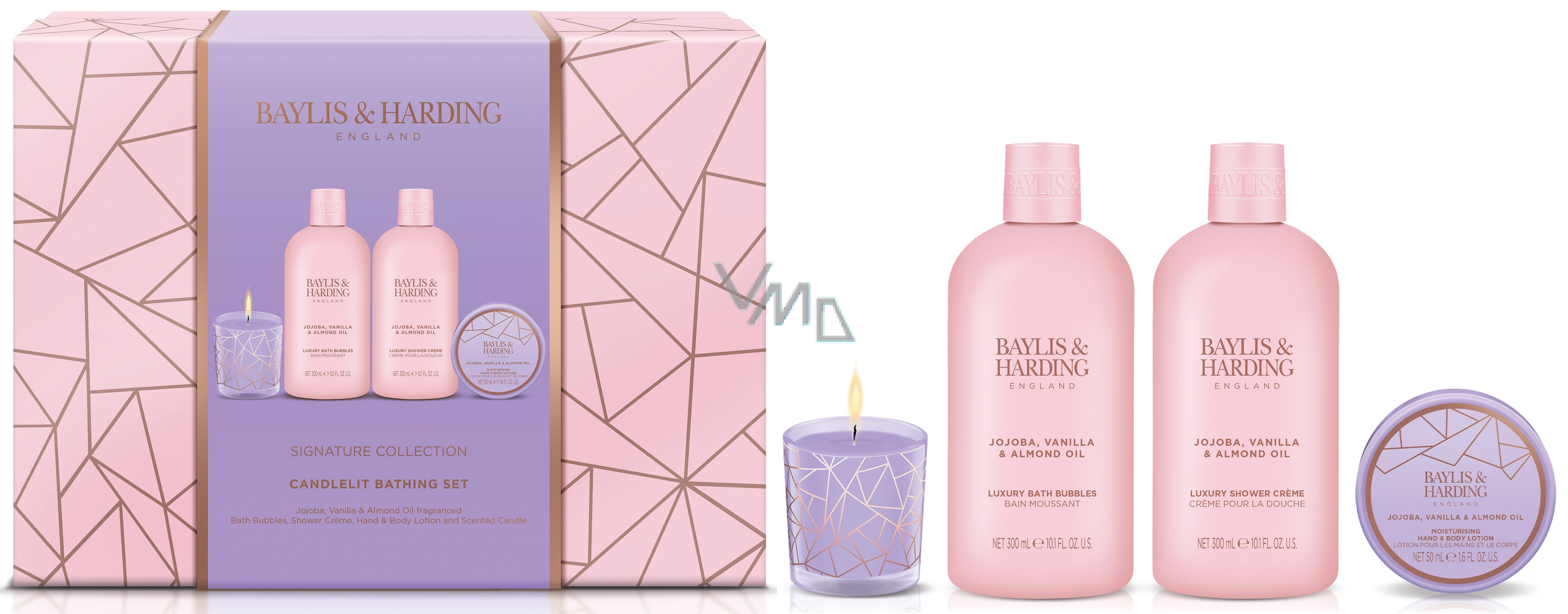 Baylis & Harding Jojoba a Vanilka pěna do koupele 300 ml + sprchový krém 300 ml + mléko na tělo a ruce 50 ml + vonná svíčka 60 g, kosmetická sada pro ženy