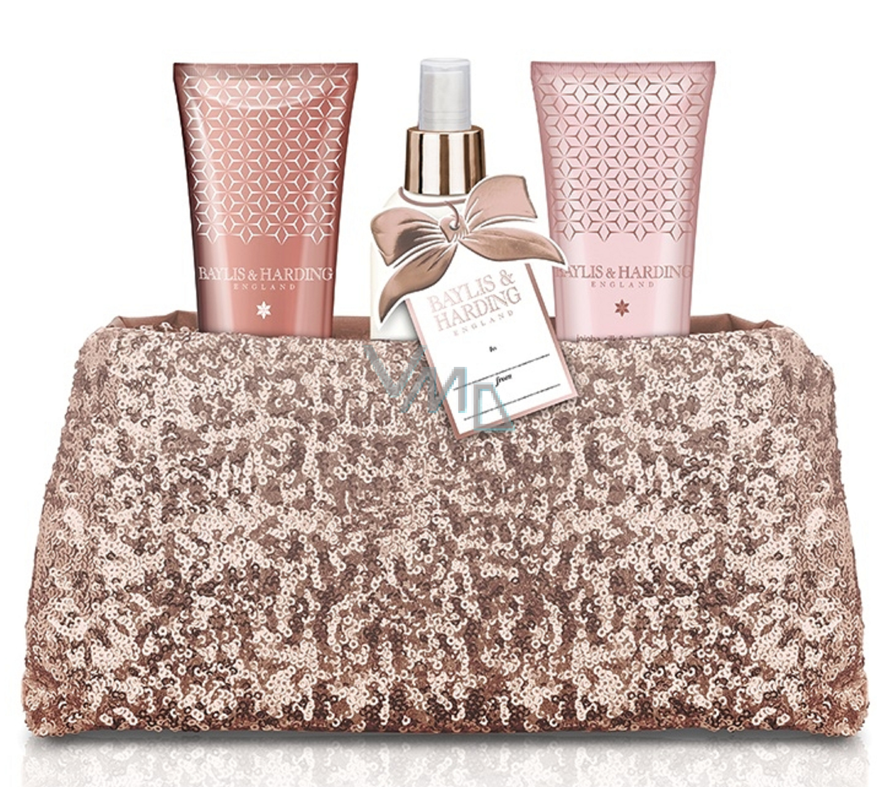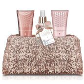 Dárková sada tří produktů péče o tělo s nádherně bohatou vůní jojoby, hedvábí a mandlového oleje v růžové flitrové kabelce.