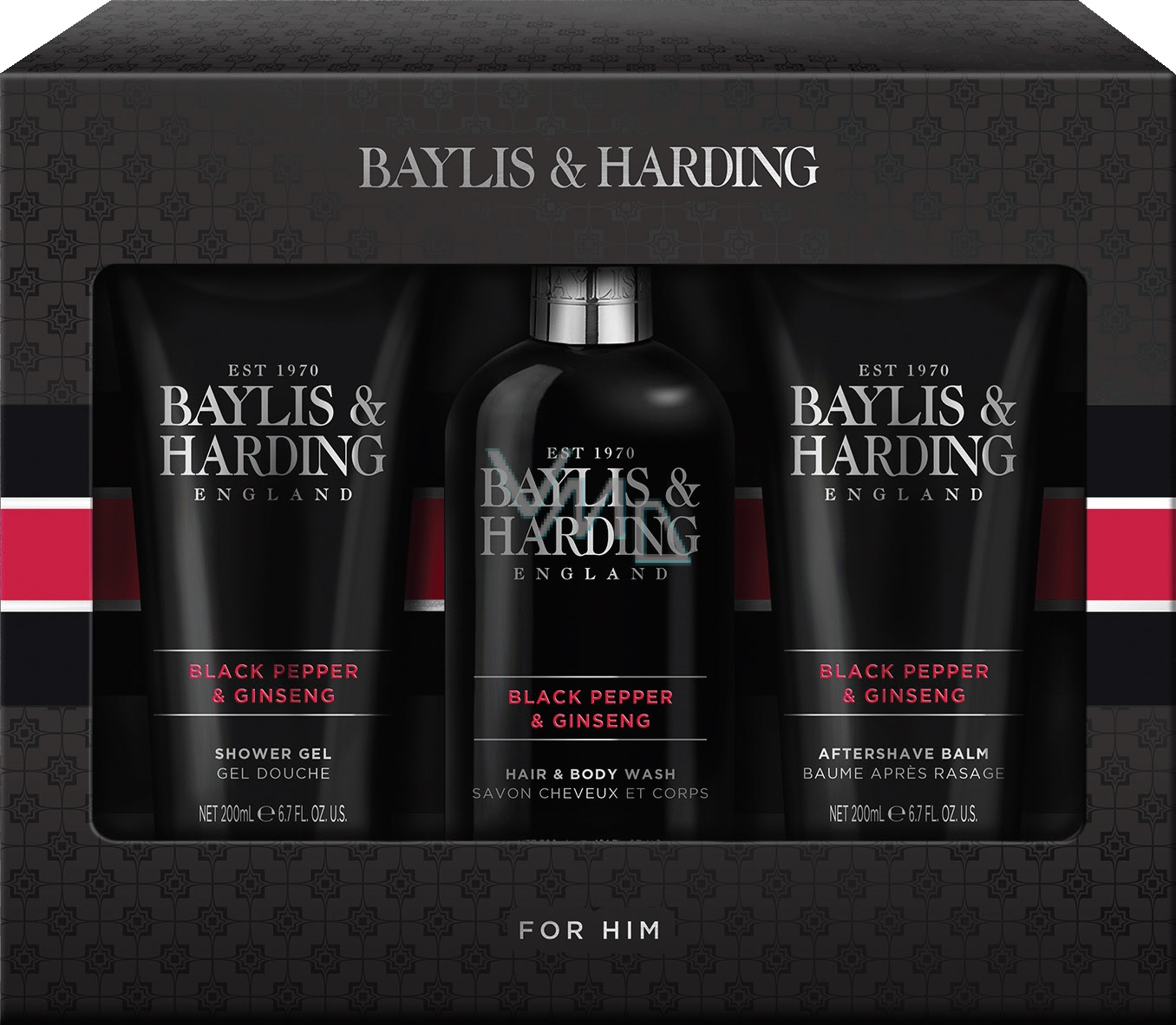 Luxusní dárkový set vás okouzlí svým černým sofistikovaným designem s výraznými červenými prvky a třemi praktickými produkty. Mycí gel na tělo a vlasy perfektně poslouží na cestách a při rychlých ranních sprchách. Balzám po holení zklidní pokožku po holení a sprchový gel tělo zvláční a zahalí do vůně černého pepře, ženšenu, santalového dřeva a cedru.