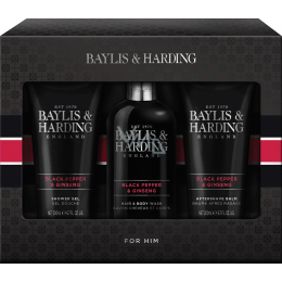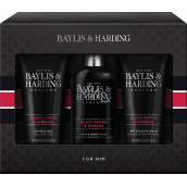 Baylis & Harding Men Černý pepř a Ženšen mycí gel na tělo a vlasy 300 ml + balzám po holení 200 ml + sprchový gel 200 ml, kosmetická sada