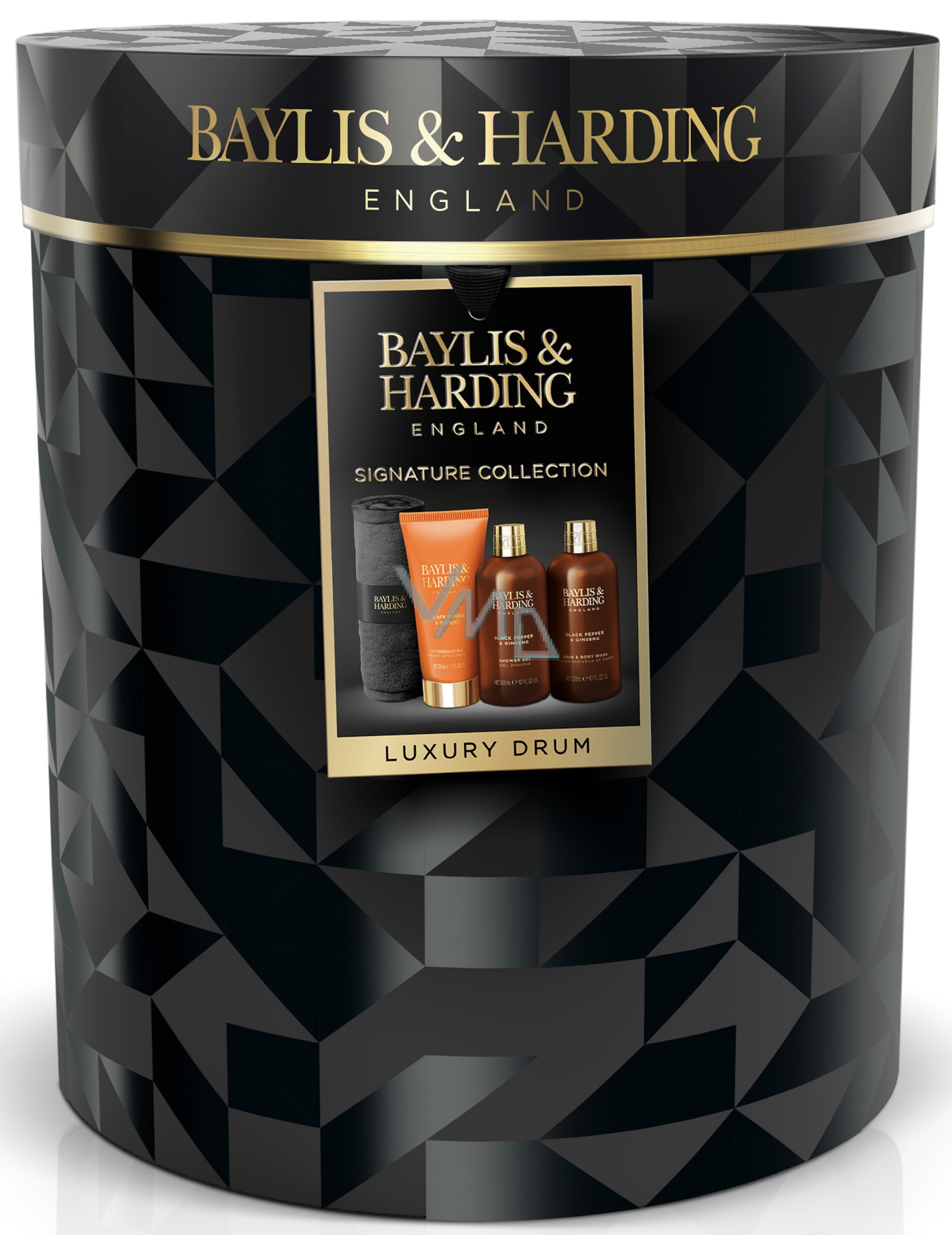 Baylis & Harding Men Černý pepř a Ženšen sprchový gel 300 ml + balzám po holení 200 ml + mycí gel na tělo a vlasy 300 ml + ručník na obličej, kosmetická sada pro muže