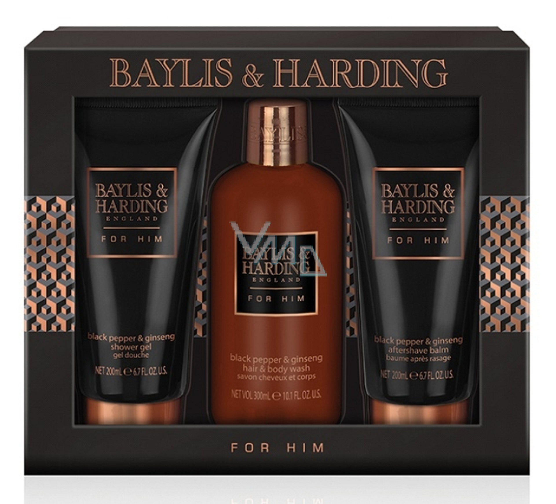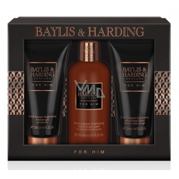 Baylis & Harding Men Černý pepř a Ženšen tekuté mýdlo na tělo i vlasy 300 ml + balzám po holení 200 ml + sprchový gel 200 ml, kosmetická sada pro muže