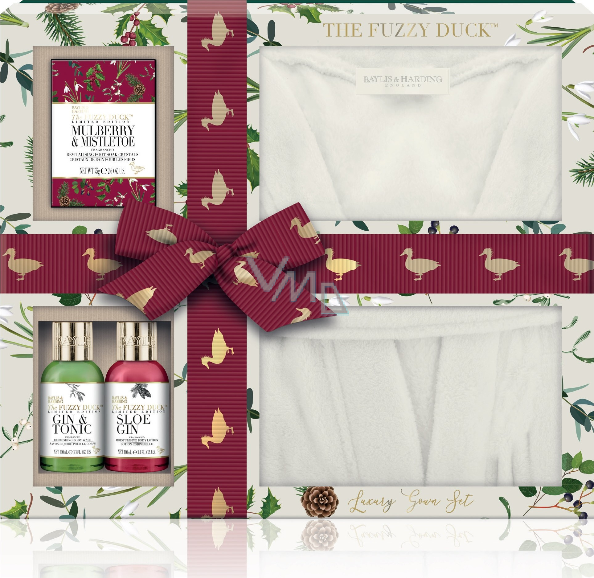 Baylis & Harding Moruše, Jmelí a Brusinka mycí gel 100 ml + koupelový a sprchový krém 100 ml + koupelové krystalky 75 g + jemný župan v bílé barvě, kosmetická sada
