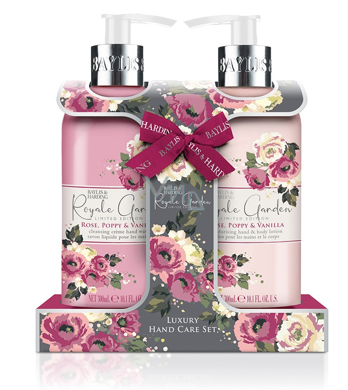 Baylis & Harding Růže, Vlčí mák a Vanilka tekuté mýdlo dávkovač 300 ml + mléko na ruce a tělo 300 ml, kosmetická sada pro ženy