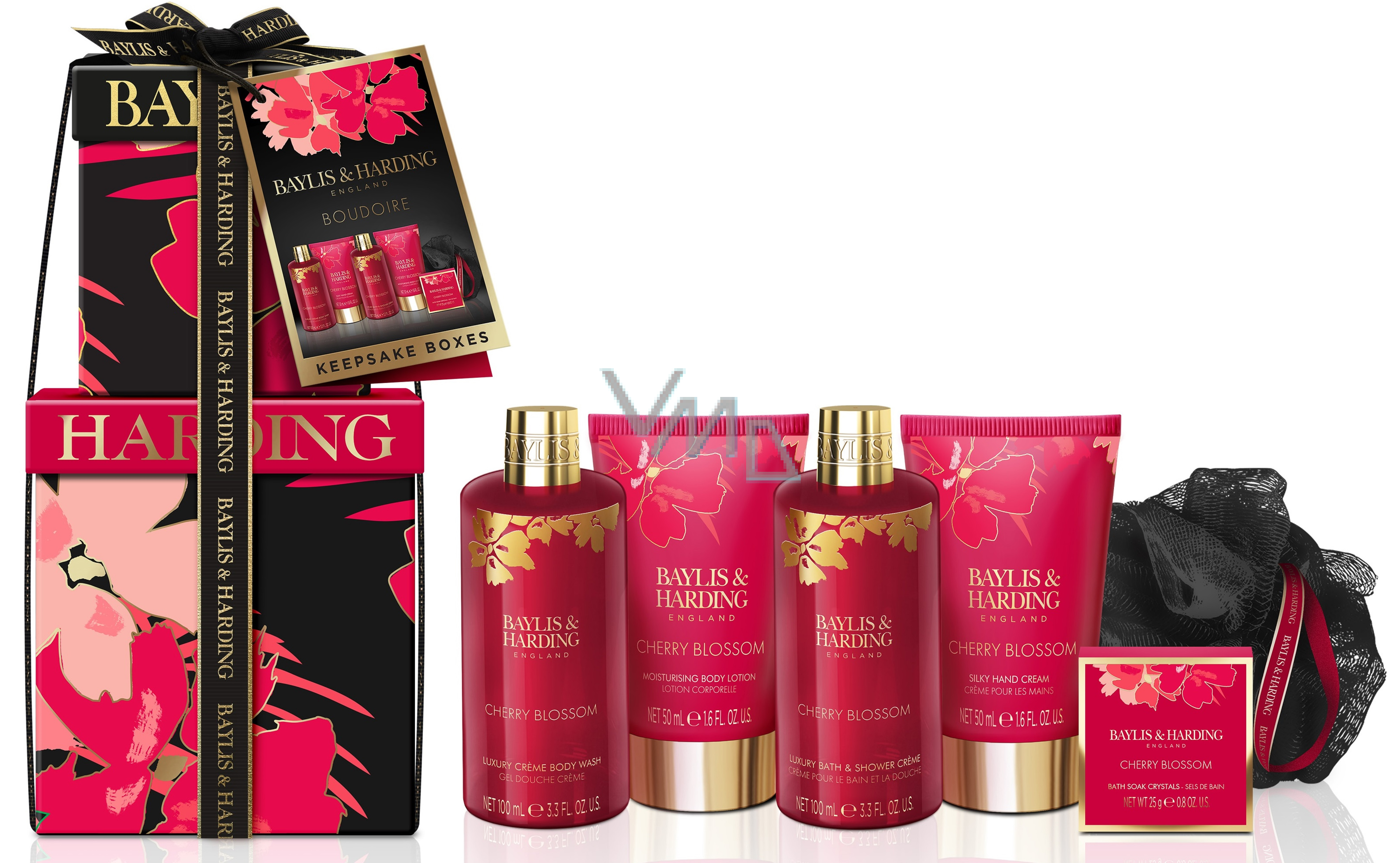 Baylis & Harding Třešňový květ sprchový gel 100 ml + sprchový krém 100 ml + tělové mléko 50 ml + krém na ruce 50 ml + krystaly do koupele 25 g + tělová houbička, kosmetická sada pro ženy