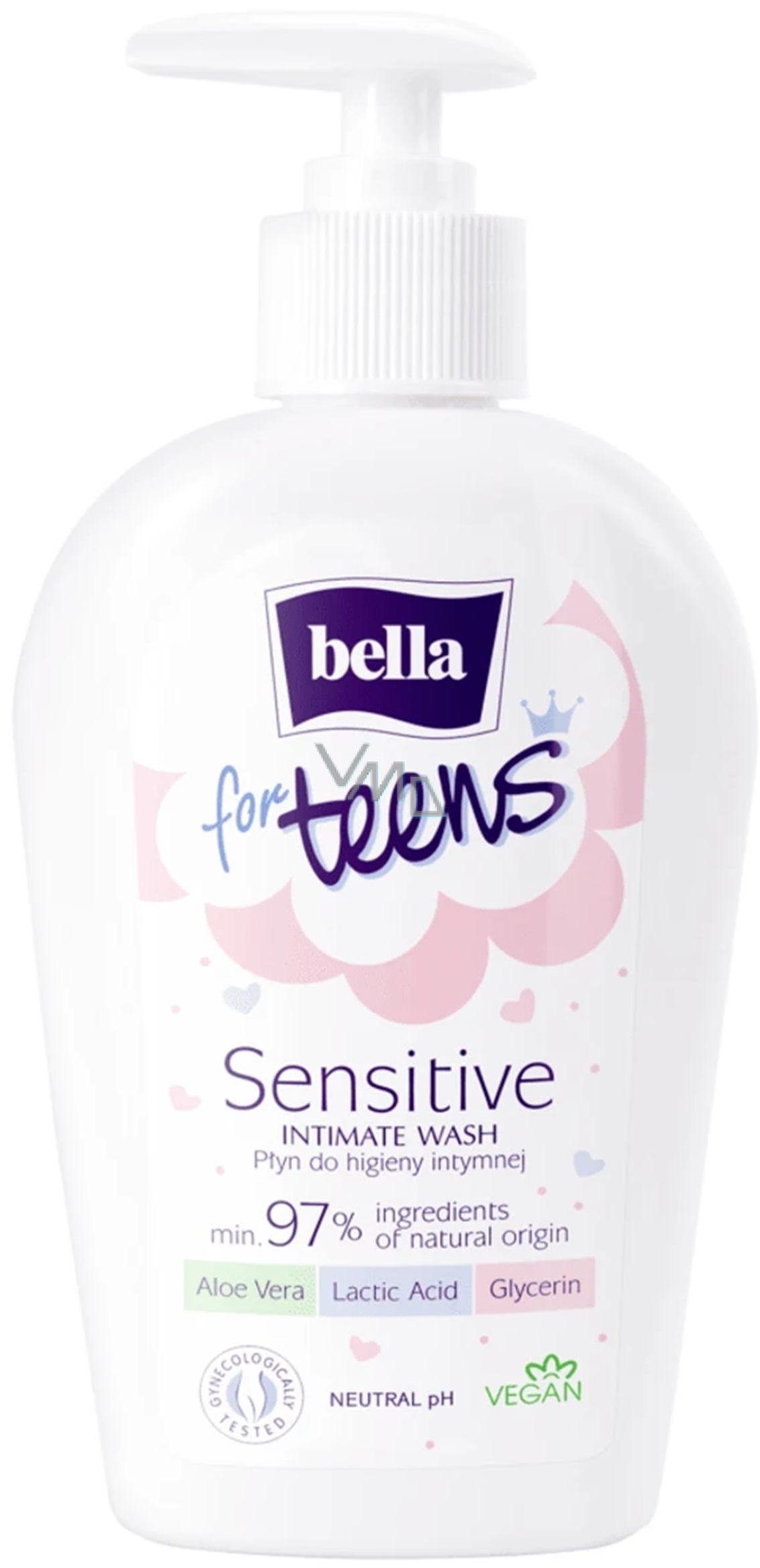 Bella intimní emulze Sensitive for Teens je jemný mycí gel vhodný pro každodenní péči o intimní partie, určený především pro dívky. Dívky v prepubertálním období mají kvůli nízké hladině estrogenu pH intimních partií zásadité či neutrální a neměly by používat intimní prostředky určené pro dospělé. Intimní emulze Sensitive for teens značky bella je vyvinuta speciálně pro dívky s citlivou pokožkou. Díky neutrálnímu pH se nenarušuje přirozená mikroflóra intimních partií a složení obohacené o aloe, kyselinu mléčnou a glycerin pokožku hydratuje a pomáhá zklidnit podráždění.