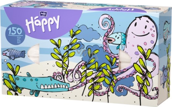 Univerzální kapesníky Happy v krabici s dětským potiskem. Dvouvrstvé kapesníky vyrobené z velmi jemného hedvábného papíru. Skvělé v každé situaci: doma, na silnici, v autě.