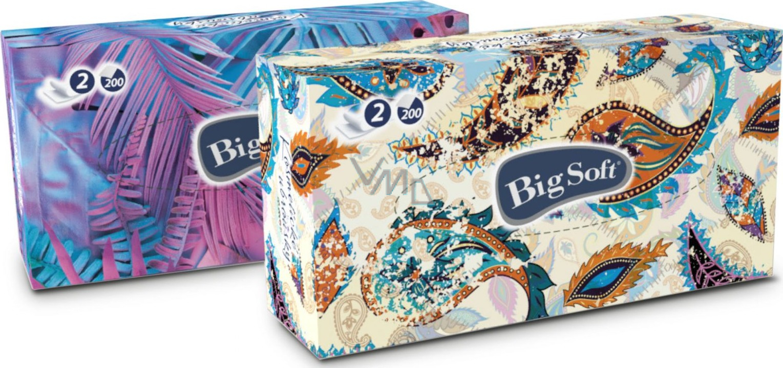 Deluxe. Jemné 2vrstvé papírové kapesníky Big Soft v praktickém balení v krabičce po 200 kusech. Moderní designová krabička s různými motivy se hodí do každé domácnosti. Kapesníky jsou vhodnou pomůckou při každodenní potřebě. Jemné kosmetické kapesníčky v praktické papírové krabičce, po použití jednoho je další připraven k okamžitému použití