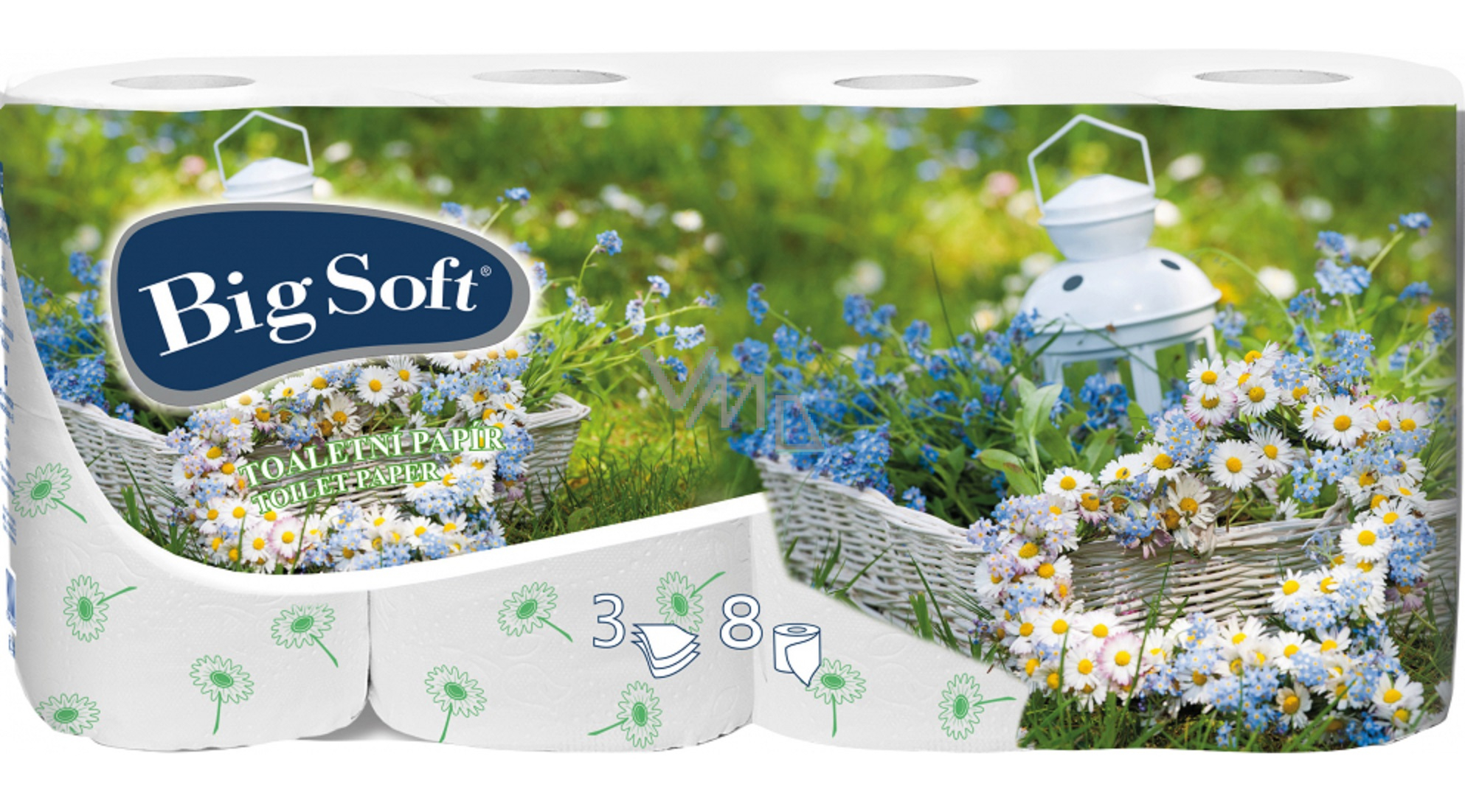oaletní papír Big Soft s jarním motivem. Velmi jemný toaletní papír 3vrstvý vyroben ze 100% celulozy.