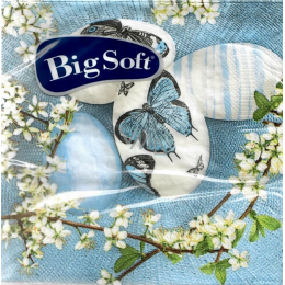 2vrstvé papírové ubrousky Big Soft s Velikonočním motivem modrých vajíček s Motýlky o rozměru 33 × 33 cm. Balení obsahuje 20 kusů papírových ubrousků.