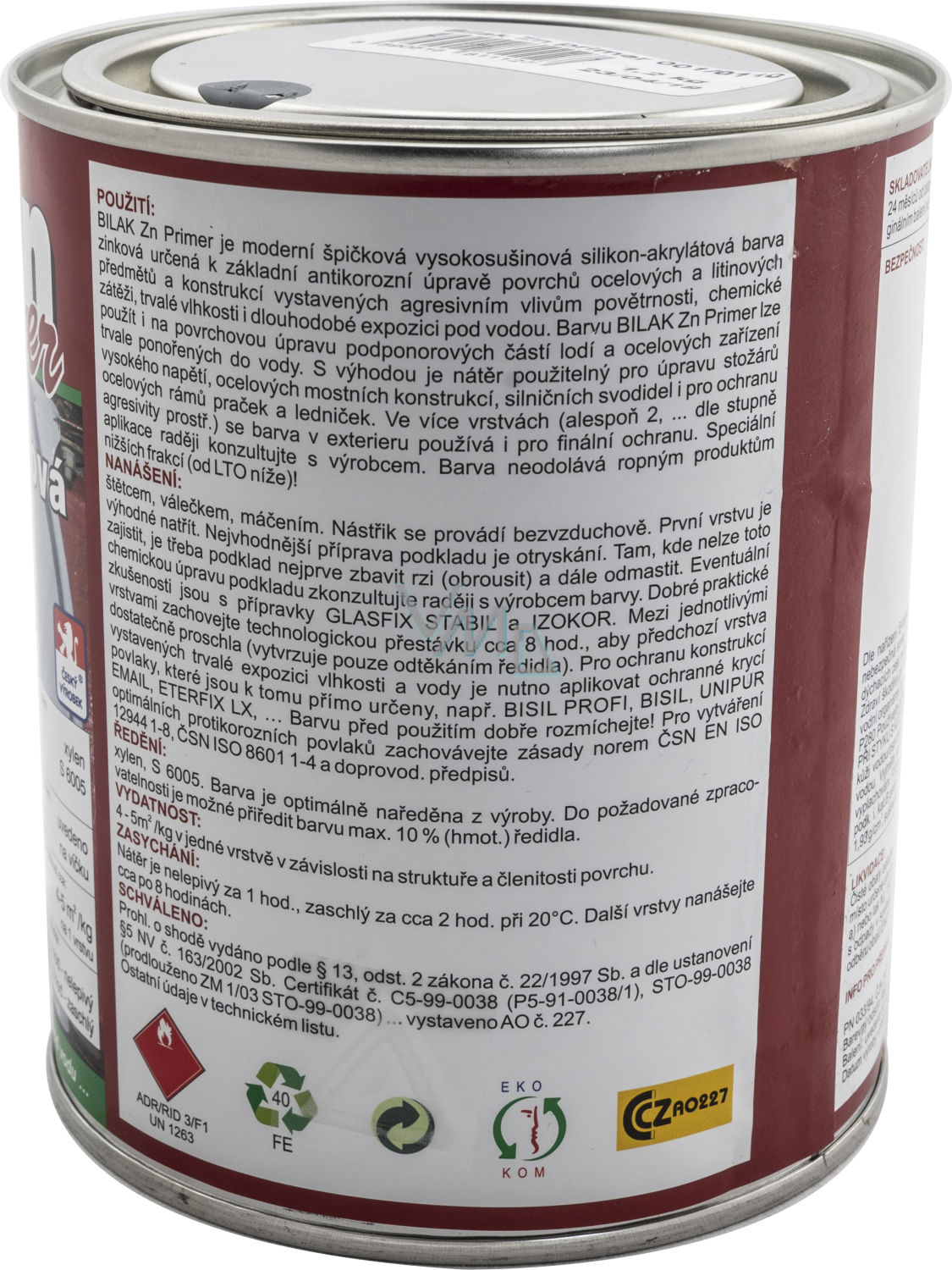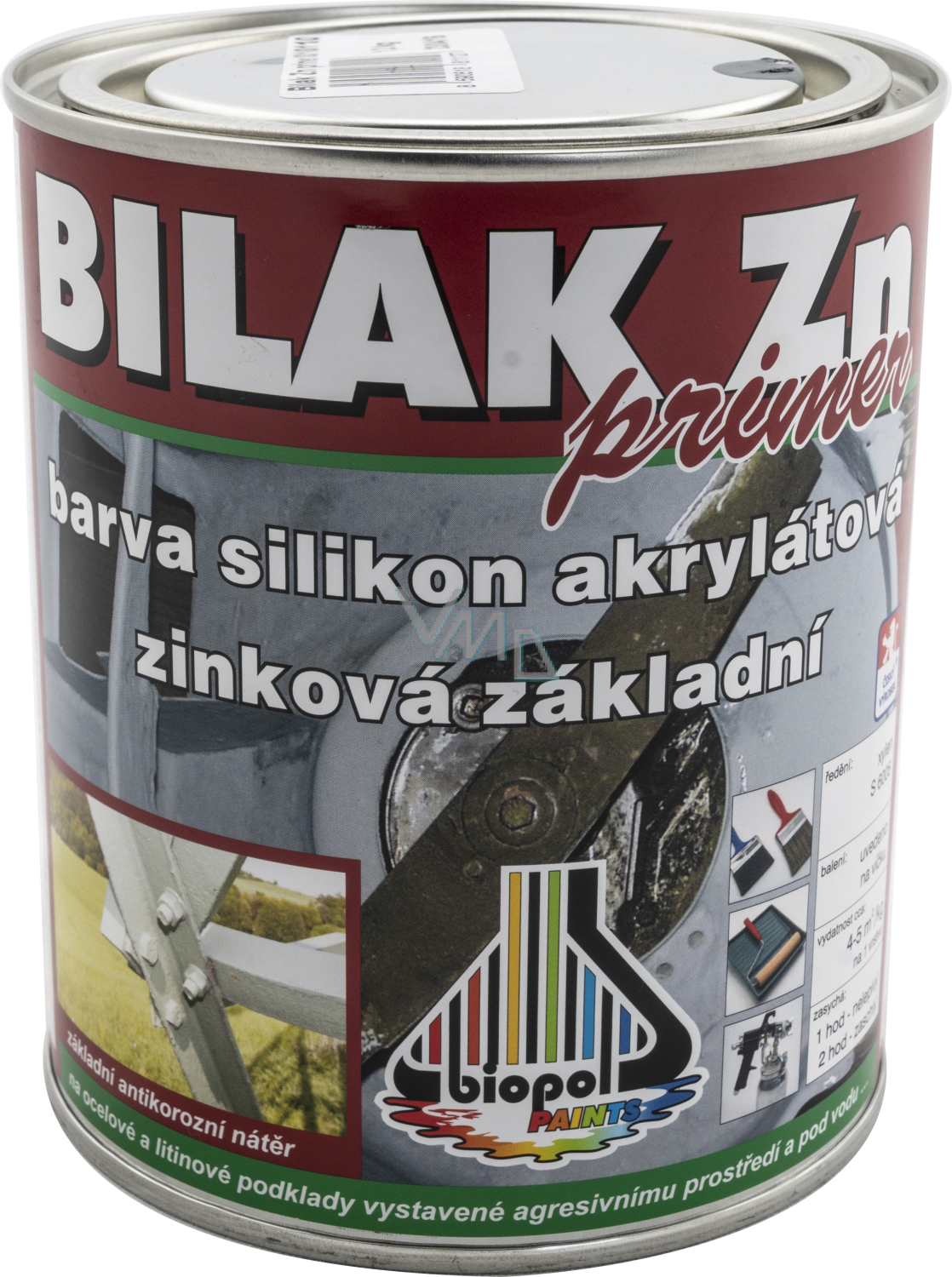 Barva je vhodná k nátěrům ocelových předmětů a konstrukcí vystavených agresivnímu prostředí (stožáry, ocelové mostní konstrukce...) pro povrchovou úpravu podponorových částí lodí a ocelových konstrukcí trvale ponořených do vody. BILAK Zn Primer je moderní špičková vysokosušinová silikon-akrylátová barva Zinková určená k základní antikorozní úpravě povrchů, na které jsou z hlediska protikorozní ochrany kladeny vysoké nároky.