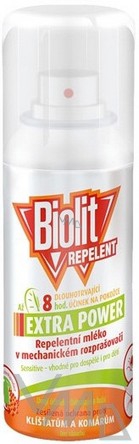 Biolit repelent Extra Power je repelentní mléko určené k aplikaci na pokožku. Díky nové technologii microenkapsulace účinných látek - zajišťuje vysokou a dlouhotrvající ochranu proti klíšťatům a komárům - až 8 hodin.