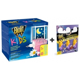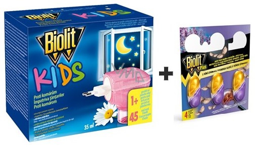 1) Biolit Kids elektrický odpařovač s tekutou náplní hubí komáry. Je určený pro použití v dětských pokojích a místech, kde se vyskytují děti. Provedení el. odpařovače zabraňuje díky pojistce těm nejmenším v šroubování náplně. Zároveň vysoce hořká přísada zabraňuje případnému nežádoucímu olizování náplně dětmi či domácími zvířaty.
