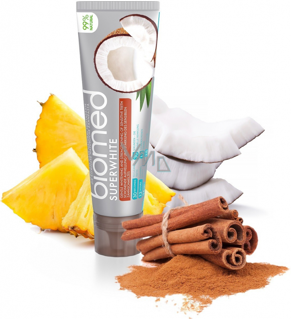 Z 99 % přírodní zubní pasta. Biomed Superwhite obsahuje kokosový olej a skořici dodávající zubní pastě zajímavou chuť. Extrakty z papáji a ananasu odstraňují zubní plak a šetrně leští zubní sklovinu. Hydroxyapatit a L-Arginin posilují a obnovují zubní sklovinu vašich zubů a extrakty z plantain banánu a listů břízy zklidňují podrážděné dásně. Zubní pasta neobsahuje fluorid. Je vhodná pro vegany, těhotné ženy, kojící matky a děti od 6 let.