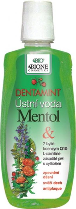 Dentamint potlačuje přítomnost a rozvoj mikroorganismů a tím působí proti parodontitidě a zubnímu kazu, neutralizuje kyselé pH v ústech. Zaručuje vonící dech a dlouhotrvající pocit čistoty a svěžesti v ústech. Dentamint je unikátní šesti bylinná ústní voda s karnitinem a koenzymem Q10, jež se podílejí na optimalizaci buněčné látkové výměny a tím zlepšují stav dásní. Rozmarýnová silice, xylitol, karnitin a proti mikrobiální složka se podílejí na potlačení ústní mikroflóry. Bikarbonát neutralizuje kyselé pH ústní dutiny po jídle a tím chrání zubní sklovinu před kyselou demineralizací a před vznikem zubního kazu. Hřebíčkový olej se s oblibou v lidovém léčitelství používá k tlumení bolesti zubů, skořicová silice prokrvuje sliznici, máta peprná, eukalyptus a anýz působí deodoračně a chladivě.