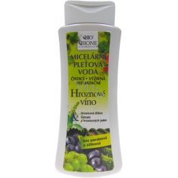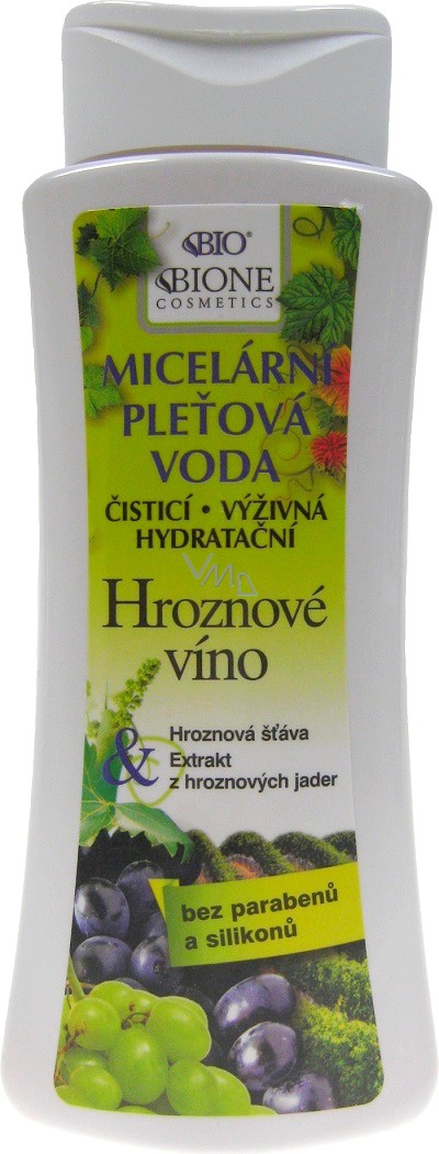 Micelární pleťová voda s vinnými produkty a odličovací pleťová voda bez jakýchkoliv konzervačních látek, bez parfému, bez silikonů, ropných produktů, aj. Přitom s výtečnou čistící účinností pro všechny typy pokožky, i pro velmi citlivou. Obsahuje šťávu z vinných hroznů a cenný antioxidační extrakt z jader červených bobulí se spoustou blahodárných flavonoidů a prokyanidinů, se silnými antioxidačními, hojivými a protizánětlivými účinky. Obsahem aktivních látek karnosin, kyselina azelaová, panthenol, nikotinamid, glycerin, allantoin a lipoamin, zajišťuje výtečnou hydrataci pleti, omezením glykace bílkovin snižuje tvorbu vrásek a zlepšuje elasticitu pokožky, dodává bioaktivní aminokyselinu glycin, potlačuje rozvoj mnoha kožních mikrobů, urychluje obnovu kyselého a mastného ochranného filmu na pokožce aj. Určeno k hloubkovému vyčištění po použití pleťového mléka, nebo zcela samostatně.