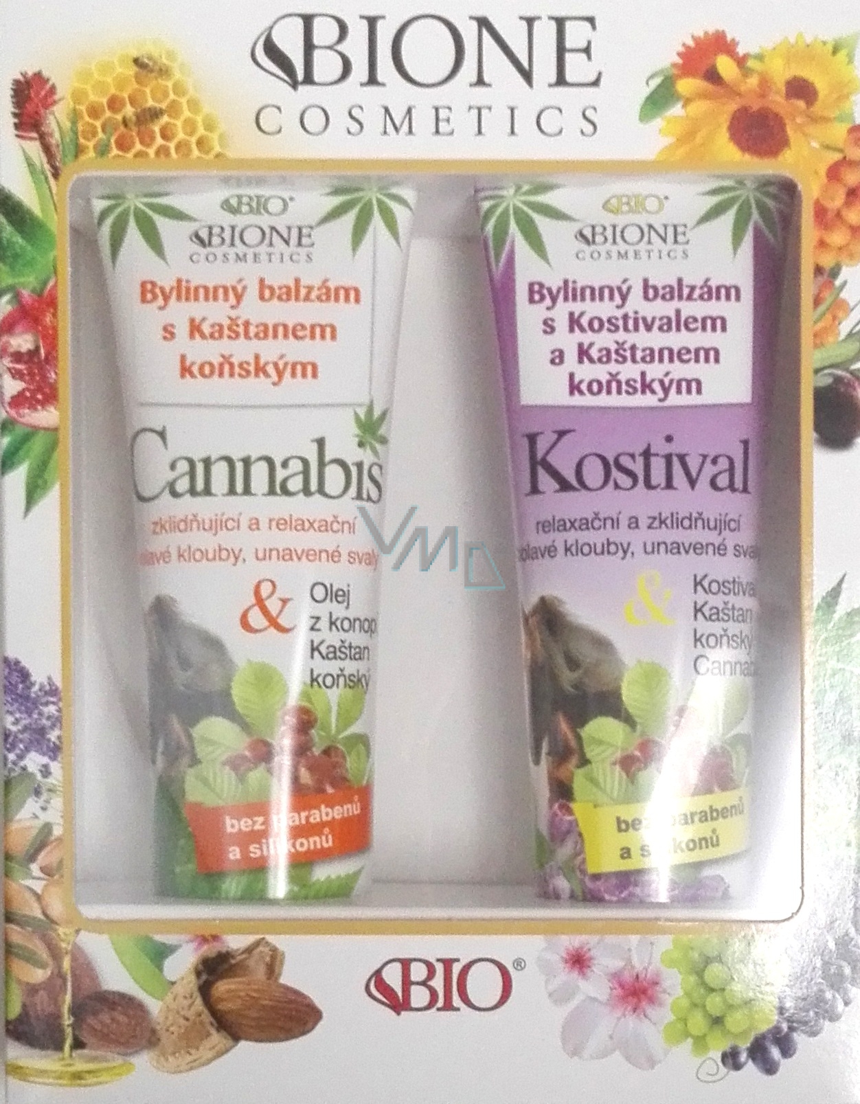 Bione Cosmetics Kostival & Kasztan koński balsam ziołowy 300 ml + Cannabis balsam ziołowy z kasztanem końskim 300 ml, zestaw kosmetyczny