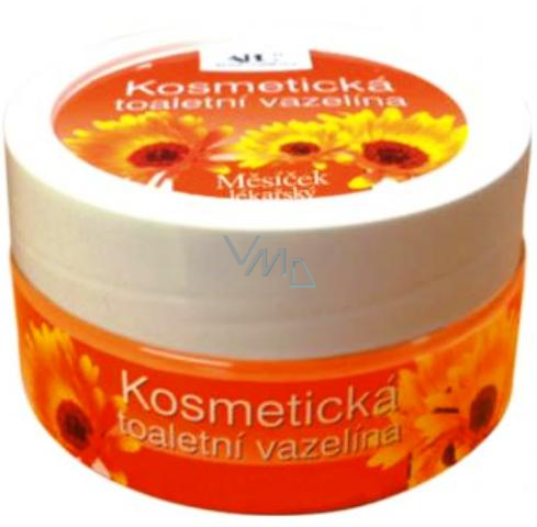 Kosmetická toaletní vazelína – nagietek lekarski nawilża, natłuszcza i uspokaja popękaną, suchą i zgrubiałą skórę. Odpowiednia na ręce, nogi itp. Delikatna, bez emulgatorów i konserwantów. Dodatek ekstraktu nagietka lekarskiego działa leczniczo, regeneracyjnie i odżywia skórę.