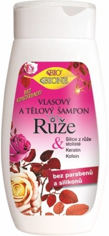 S podmanivou a relaxační vůní růže stolisté, regenerační silou keratinu a podporou růstu vlasů pomocí oblíbeného kofeinu. Keratinový hydrolyzát z ovčí vlny obsahuje aminokyseliny shodné s aminokyselinami lidských vlasů. Používáním šamponu Růže s obsahem keratinu dochází k doplnění vlasové struktury narušené slunečním zářením, barvením, trvalou ondulací, fénováním, odbarvováním a stárnutím. Vlasy se zpevní, vrátí se jejich pružnost a lesk, netřepí se. Šampon je doplněn o regenerační panthenol a o kondicionační rostlinný lecithin. Lesk a hladkost vlasů jsou podpořeny přídavkem vzácného makadamiového oleje. Přípravek je obohacen o populární kofein, který je dle studií prokazatelný stimulant růstu vlasových folikul.