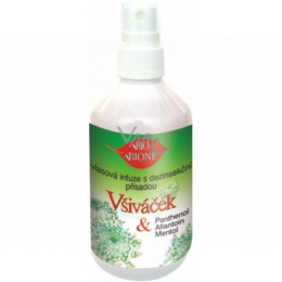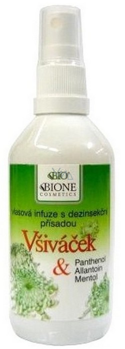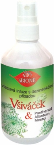 Bione Všiváček vlasová infuze s přísadou extraktu dalmatské chryzantémy se používá jako pomocný a podpůrný vlasový sprej při napadení všemi. Obsahuje pro pokožku hojivý a regenerační panthenol, allantoin a mentol, který poskytuje chladivou úlevu podrážděné pokožce.