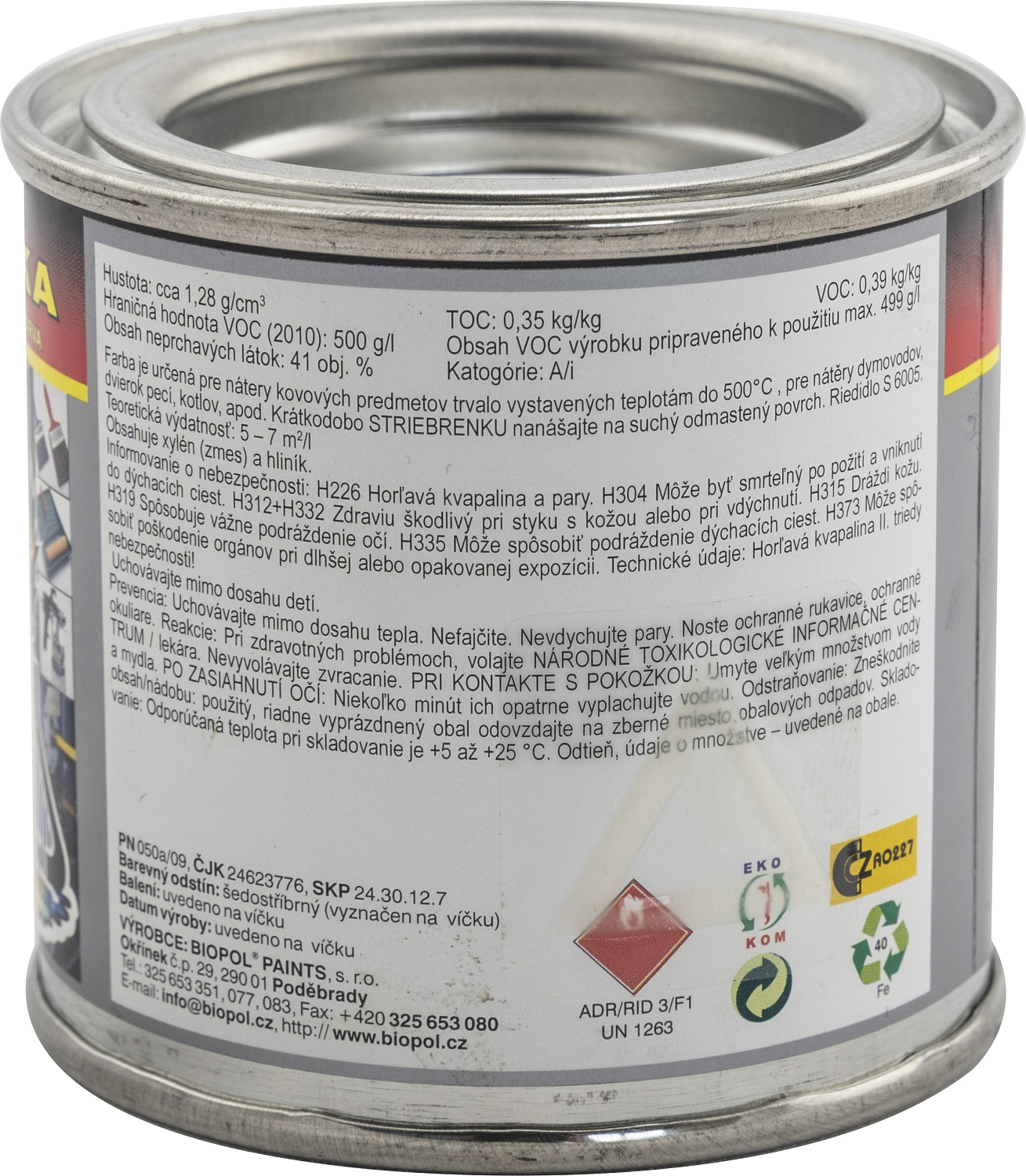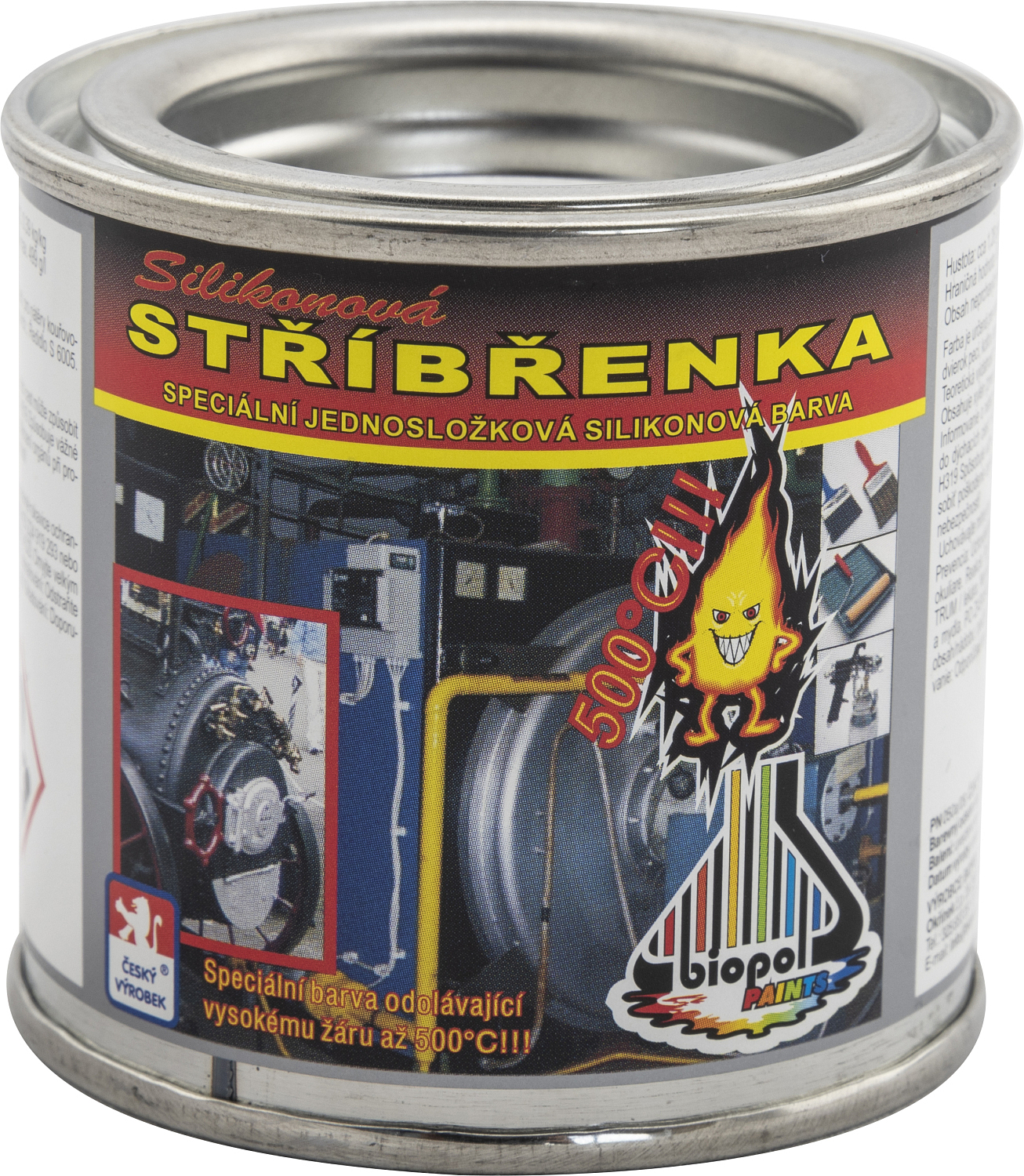 Biopol Paints Silikonowa sreberka, tę żaroodporną farbę można zastosować do skutecznej ochrony przedmiotów i konstrukcji stalowych oraz żeliwnych, które są narażone na cykliczne i termiczne obciążenia (wymienniki ciepła, rury spalinowe, wydechy samochodowe, rury parowe). Wypalona powłoka jest odporna na rozpuszczalniki organiczne, ropę, benzynę oraz rozcieńczone roztwory kwasów i zasad. Silikonowa sreberka została opracowana w celu skutecznej ochrony przedmiotów i konstrukcji stalowych oraz żeliwnych narażonych na cykliczne termiczne obciążenia. Farba jest formułowana na bazie najlepszej silikonowej żywicy i specjalnej kompozycji aluminiowej, które nie degradują nawet przy temperaturze około 500 °C. Trwale wytrzymuje temperaturę do 500 °C. Sreberkę można z powodzeniem stosować do ochrony części silników, wymienników ciepła, rur spalinowych, wydechów ze rdzewiejącej stali, stalowych rur dla pary gorącej oraz gorącej. Niewypalona farba ma porównywalne właściwości ochronne względem warunków atmosferycznych. Jest jednak miększa i nie chroni podłoża przed działaniem rozpuszczalników organicznych. Farba nakładana jest w co najmniej dwóch warstwach w zależności od agresywności środowiska zewnętrznego. Dla standardowych warunków atmosferycznych minimalna grubość utwardzonej powłoki wynosi 13 μm (co odpowiada 3-4 malowaniom).