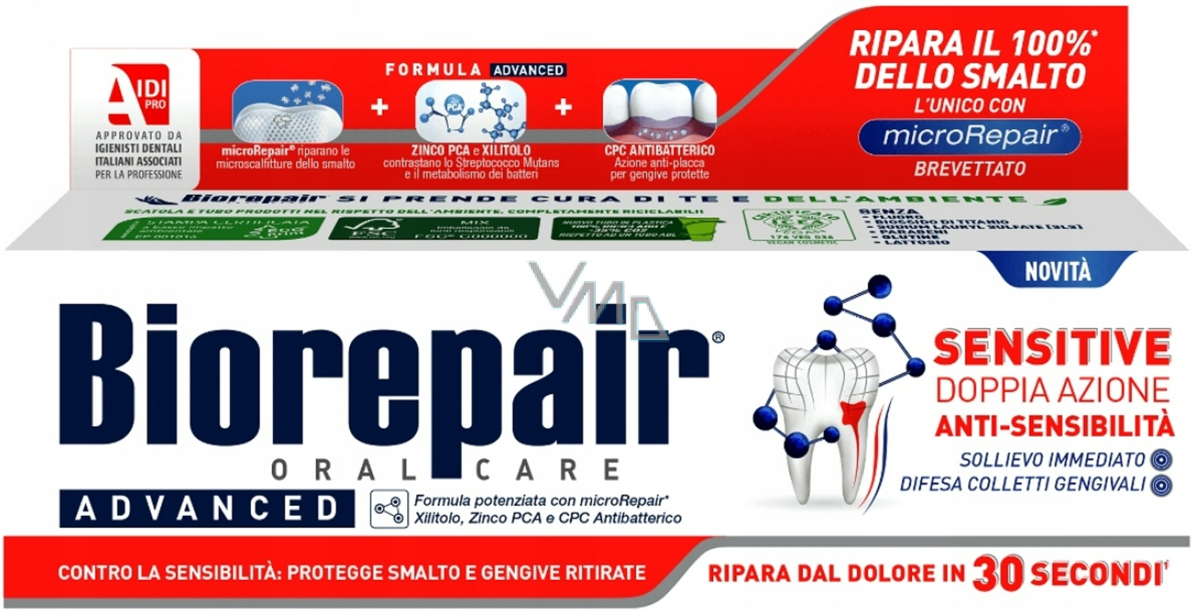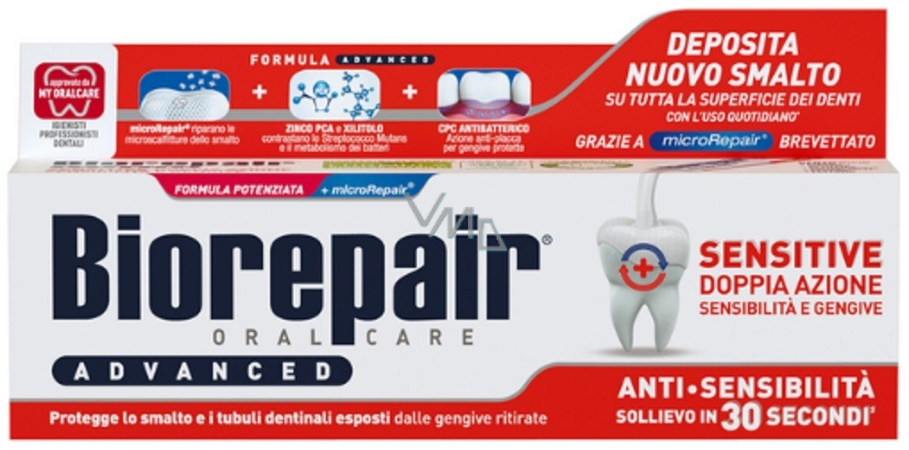 Pasta do zębów z zaawansowaną formułą chroni szkliwo i cofające się dziąsła przed nadwrażliwością – ulga w ciągu 30 sekund. Wykorzystuje technologię microRepair®, która zawiera biomimetyczny, hydroksyapatyt aktywne mikrocząsteczki o składzie podobnym do tkanki zębowej. Mikrocząsteczki są w stanie wniknąć w mikrospękania zębów, naprawić uszkodzone szkliwo i wypełnić odsłonięte kanaliki w szyjce zęba. MicroRepair® otacza zęby i tworzy trwałą barierę ochronną, która zapobiega temu, aby bodźce termiczne dotarły do nerwu zęba.