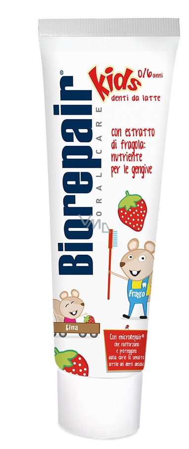 Zubní pasta pro děti Biorepair Junior je účinná zubní pasta bez obsahu fluoridu, která má příchuť a vůni jahod. Dětská pasta s unikátním složením má stejný obsah účinných látek jako pasta pro dospělé, ale díky speciální jahodové příchuti ji budou vaše děti rádi používat. Pasta Junior obsahuje inovativní a patentovanou technologii s revoluční účinnou látkou microRepair. Tato látka je schopna na povrchu zubu znovu vybudovat povrchovou vrstvu velmi podobnou zubní sklovině, která dokáže zuby ochránit před zubním kazem.
