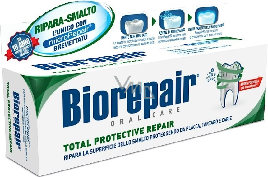 Chociaż pasta do zębów BioRepair Total Protective Repair nie zawiera fluorków, zapewnia ochronę zębów przed próchnicą. Dodatkowo zapobiega osadzaniu się płytki nazębnej a technologia MicroRepair zmniejsza wrażliwość zębów na ciepłe i zimne bodźce.