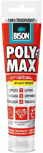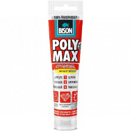 Bison Poly Max Crystal Express to przezroczysty, szybkoschnący, wyjątkowo wysokiej jakości specjalny klej montażowy do łączenia i mocowania gładkich, chłonnych i niechłonnych materiałów w wnętrzach i na zewnątrz. Wytrzymałość manipulacyjna osiąga już po 30 minutach, wytrzymałość funkcjonalna już po około 4 godzinach (jeśli przynajmniej jeden materiał jest chłonny). Klejony złącze jest elastyczne, absorbuje wibracje, nie kurczy się i ma dużą zdolność łączenia. Klej jest odporny na wilgoć, warunki atmosferyczne i temperatury od -40°C do +100°C i jest przetłaczalny. Wydajność 5 - 8 m2/kg.