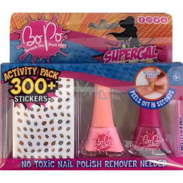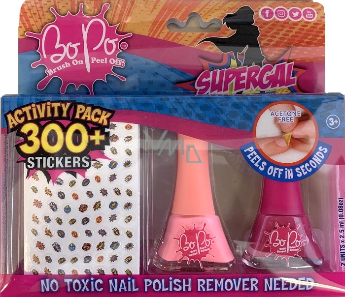 Bo-Po Supergal lak na nehty slupovací světle růžový 2,5 ml + lak na nehty slupovací tmavě růžový 2,5 ml + nálepky na nehty, kosmetická sada pro děti