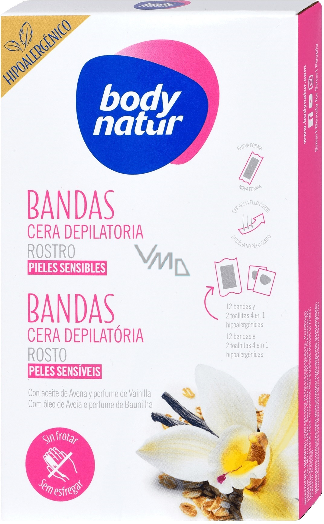 Body Natur depilační pásky na obličej vám zajistí jednoduchou epilaci díky inovativnímu složení obohaceného o květy ovsa s vanilkou Poskytuje dlouhodobé výsledky (až 4 týdny) a pečují o citlivou pleť. Ještě lepšího efektu dosáhnete s použitím poepilačních ubrousků, které pleti dodají hydrataci, zklidnění a rozjasnění. Pásky se mohou používat i na krátké chloupky.