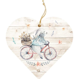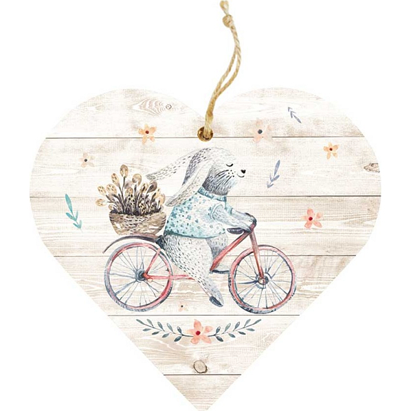 Dřevěné dekorační srdce k zavěšení - Zajíc na kole. Šířka 120 mm, tloušťka 10 mm. Dřevěná dekorace k ozdobení vašeho domu, bytu nebo chalupy.
