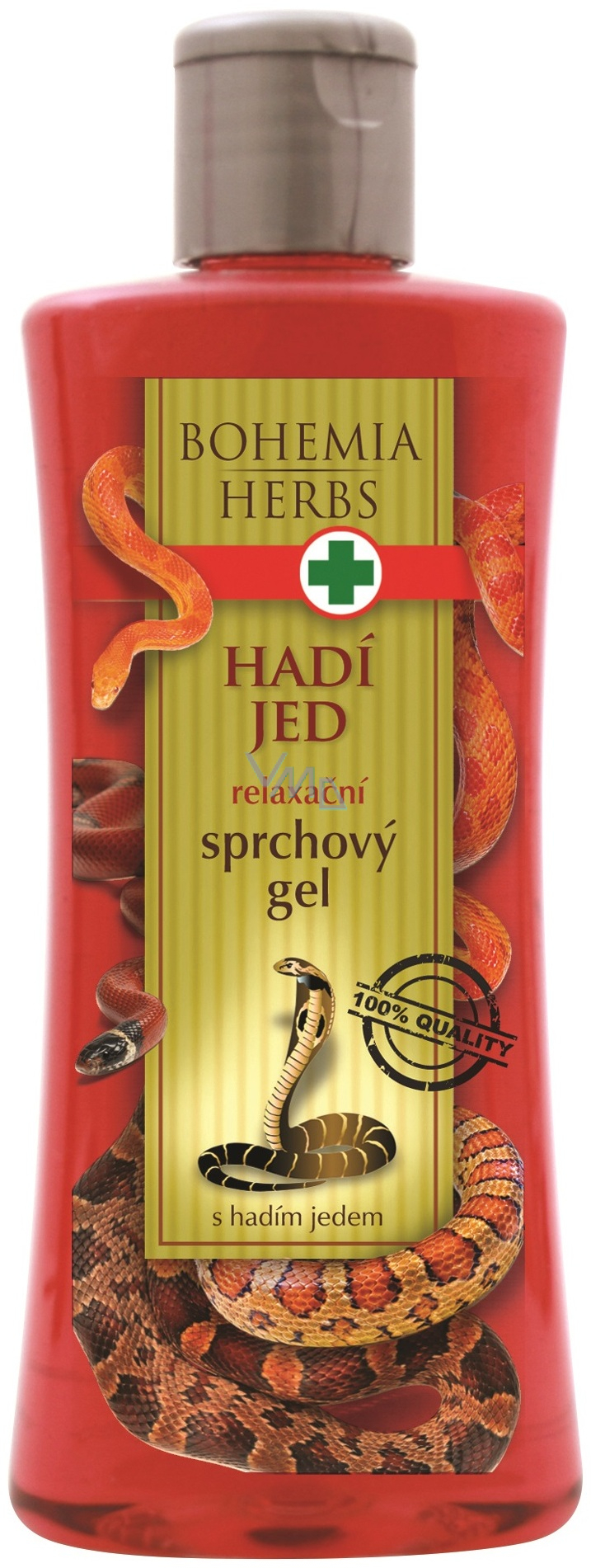Bohemia Herbs - sprchový gel se syntetickým hadím jedem. Syntetický hadí jed je bezpečná netoxická kosmetická surovina. Obsahuje unikátní syntetický hadí jed, založený na tripeptidech, které mají podobný účinek jako peptid v jedu Chřestýšovce Waglerova (Tropidolaemus wagleri), působí relaxačně na unavenou pokožku a spolu vyváženým pH a dalšími aditivy zaručují dokonalé a šetrné mytí při zachování přirozeného ochranného filmu a vlhkosti pokožky.