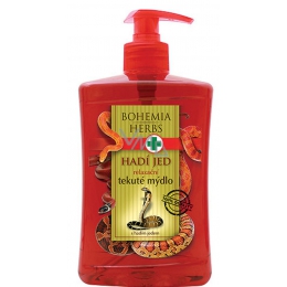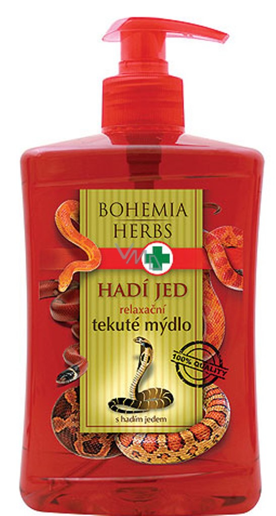 Bohemia Herbs - tekuté mýdlo se syntetickým hadím jedem. Syntetický hadí jed je bezpečná netoxická kosmetická surovina. Obsahuje unikátní syntetický hadí jed, založený na tripeptidech, které mají podobný účinek jako peptid v jedu Chřestýšovce Waglerova (Tropidolaemus wagleri), působí relaxačně na unavenou pokožku a spolu vyváženým pH a dalšími aditivy zaručují dokonalé a šetrné mytí při zachování přirozeného ochranného filmu a vlhkosti pokožky.
