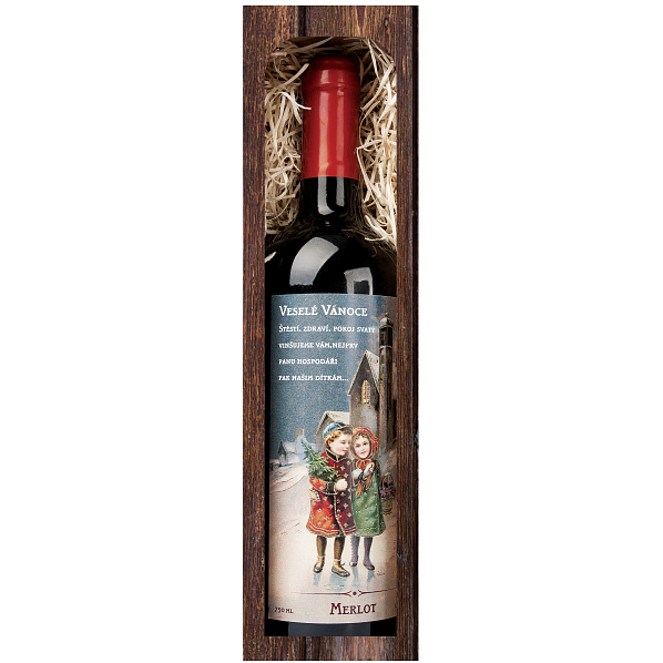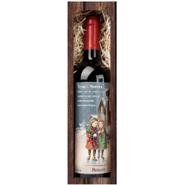 Dárkové vánoční víno v krabičce 0,75 l s koledou - Veselé Vánoce. Originální vánoční dárek. Unikátní kolekce kvalitních dárkových vín. Suchá odrůdová vína z hroznů pěstovaných na prosluněných španělských vinicích v oblasti Kastilie, z oblastí s dlouholetou tradicí výroby vín.