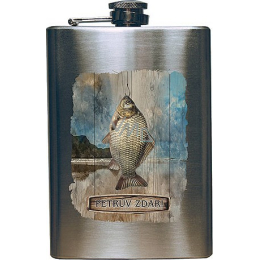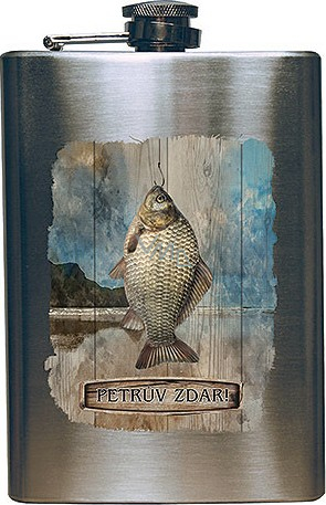 Nerezová placatka na alkohol 200 ml s potiskem pro rybáře - Petrův zdar, balená v dárkové krabičce s obrázkem ryby. Krásný dárek pro rybáře.